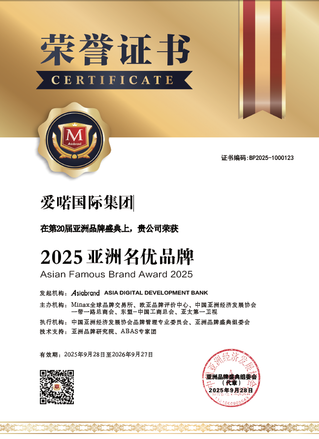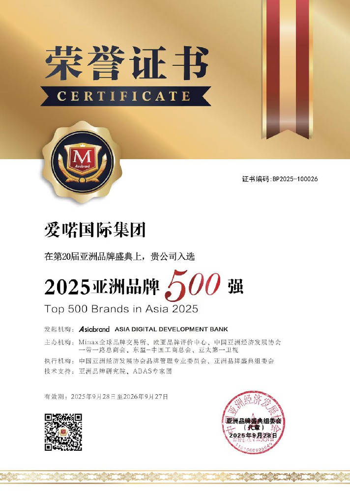 爱喏国际企业集团先后荣获2021-2023”TOP BRAND AWARDS”,2021-2024年“亚洲品牌500强”和2021-2024“亚洲名优产品奖”。